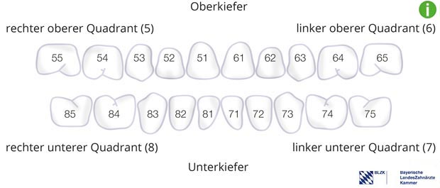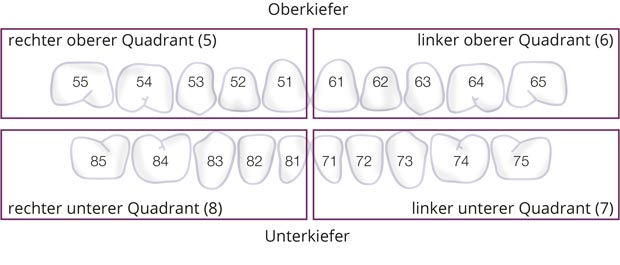 Zahnmediziner in Deutschland bezeichnen die einzelnen Zähne nach dem sogenannten FDI-Schema*, dem international gebräuchlichsten Zahnschema. Dazu teilen sie Ober- und Unterkiefer in einen linken und rechten Quadranten auf.** In den Quadranten werden die Zähne von vorne nach hinten durchnummeriert. Die erste Ziffer steht für den Quadranten, die zweite für die Position des Zahns. Der erste rechte Milchbackenzahn wird z.B. als „fünf vier“ bezeichnet.