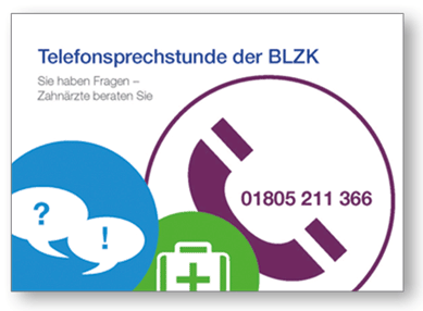 In der Telefonsprechstunde der Bayerischen Landeszahnärztekammer (BLZK) können sich Patienten unter 01805 211366 kostenlos beraten lassen. Zahnärzte beantworten alle Fragen zu Zähnen und Mundgesundheit am Telefon. Die telefonische Beratung der BLZK ergänzt die Beratung in der Zahnarztpraxis.