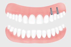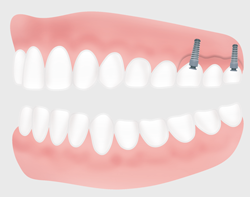 Am Ende der Zahnreihe im Oberkiefer fehlen 3 Zähne (Freiendlücke). 2 Implantatkörper sind als Stützpfeiler für eine Teilprothese in die äußeren beiden Zahnlücken eingesetzt.