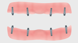 In den zahnlosen Ober- und Unterkiefer sind jeweils als Stützpfeiler für eine Totalprothese die Implantatkörper eingesetzt.